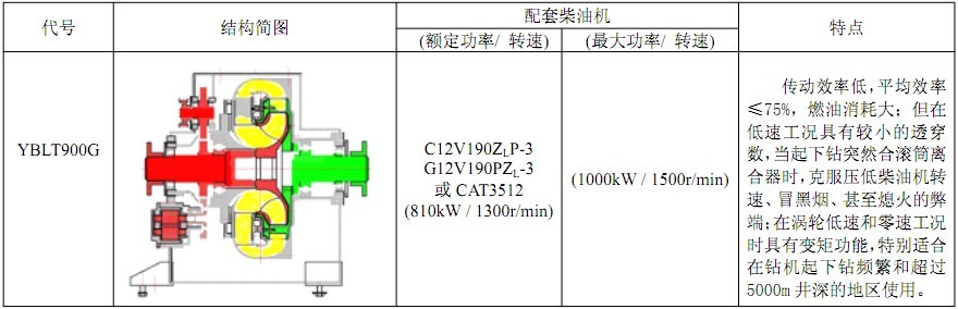 1985年研制成功的YBLT900型離心變矩器,取代從國(guó)外進(jìn)口的原CHC750型變矩器。而 YBLT900型變矩器為單級(jí)渦輪變矩器,在循環(huán)圓內(nèi)布置泵輪、渦輪和導(dǎo)輪各一個(gè)。采用間隙密封,軸承齒輪的潤(rùn)滑與變矩器的工作油均為同一種油。與原CHC750變矩器相比,具有較高的效率、使用可靠、壽命長(zhǎng)和維護(hù)方便等優(yōu)點(diǎn),近十多年來,與12V190和CAT3512等型柴油機(jī)匹配,應(yīng)用在國(guó)產(chǎn)ZJ40~70L型鉆機(jī)上,作為柴油機(jī)與并車鏈條箱之間的傳動(dòng)裝置,得到了廣泛的應(yīng)用。2009年我公司對(duì)該型號(hào)變矩器進(jìn)行了改進(jìn),形成了YBLT900G改進(jìn)型離心變矩器,其結(jié)構(gòu)特點(diǎn)是:①.采用沿軸心線水平分箱的鋼板焊接箱體,取代原變矩器分為左、中、右垂直分箱的鑄造箱體,克服了原變矩器垂直分箱面及鑄造缺陷造成的易漏油缺點(diǎn),同時(shí)使得變矩器的裝拆更加容易,方便了現(xiàn)場(chǎng)的維護(hù);②.供油泵及其進(jìn)入油冷卻的管線均布置在箱體內(nèi),取消了橡膠軟管線,提高了油管路使用的可靠性;③.焊接箱體改善了外觀質(zhì)量;④.改進(jìn)型與原型變矩器的安裝尺寸完全相同,兩者可以進(jìn)行互換。