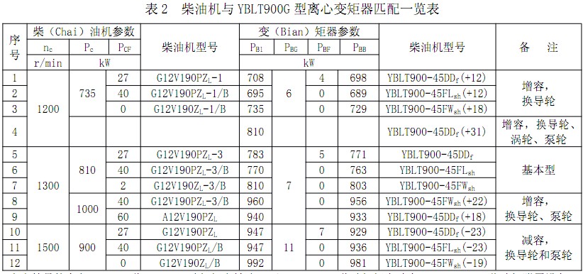 ● 柴油機(jī)與YB900G離心變矩器匹配一覽表